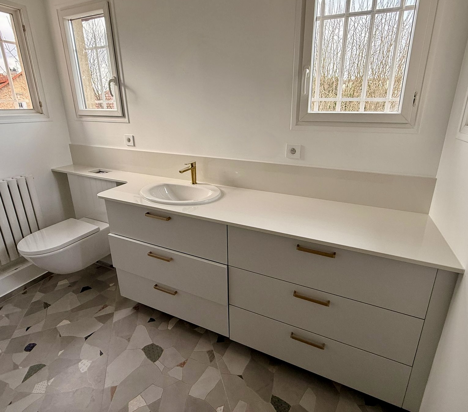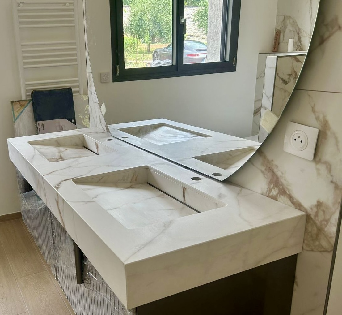 Plans vasques, vasques moulées, habillages de baignoire ou receveurs sur mesure : nous réalisons des pièces pensées pour durer.
