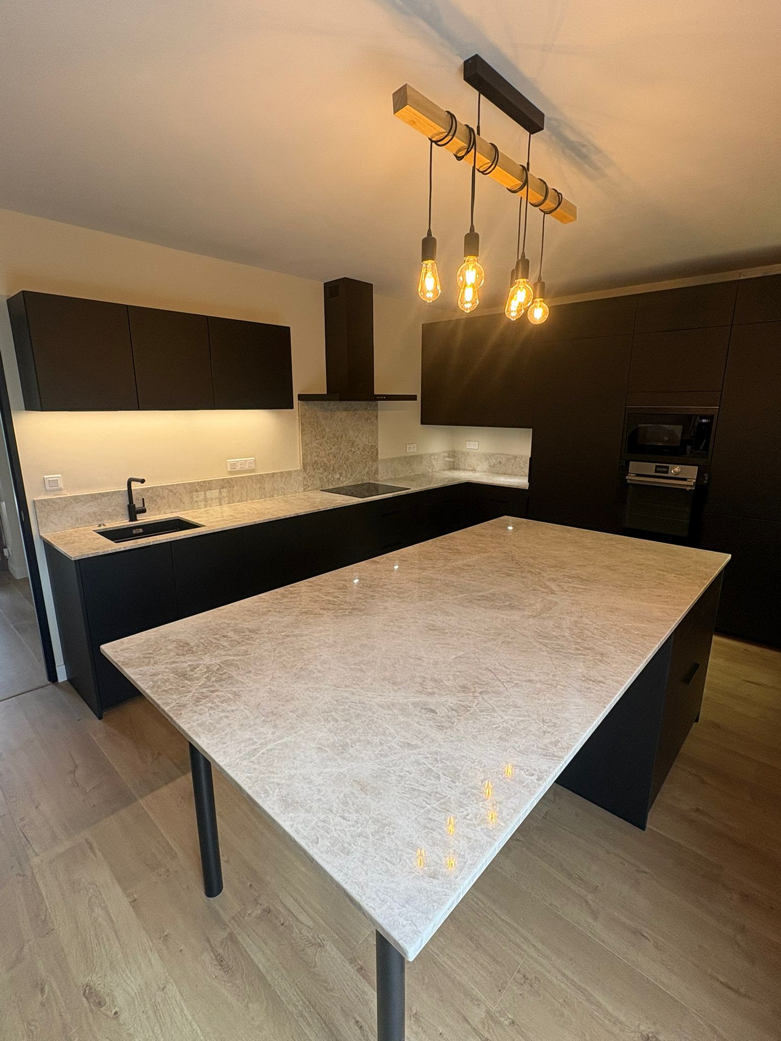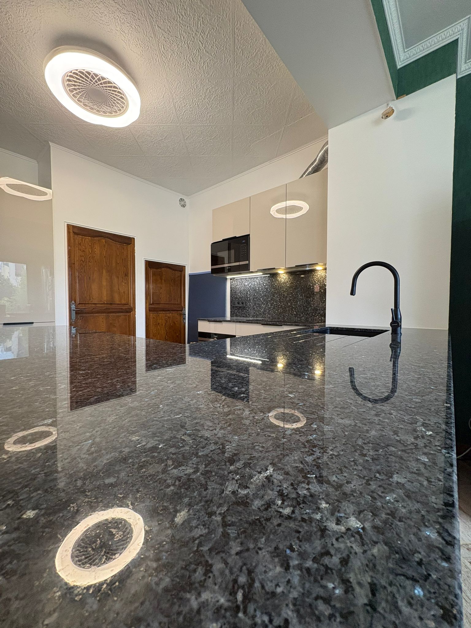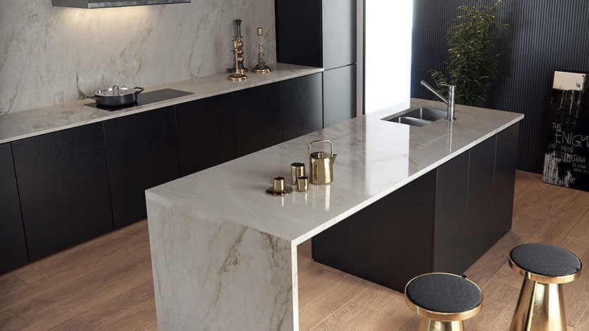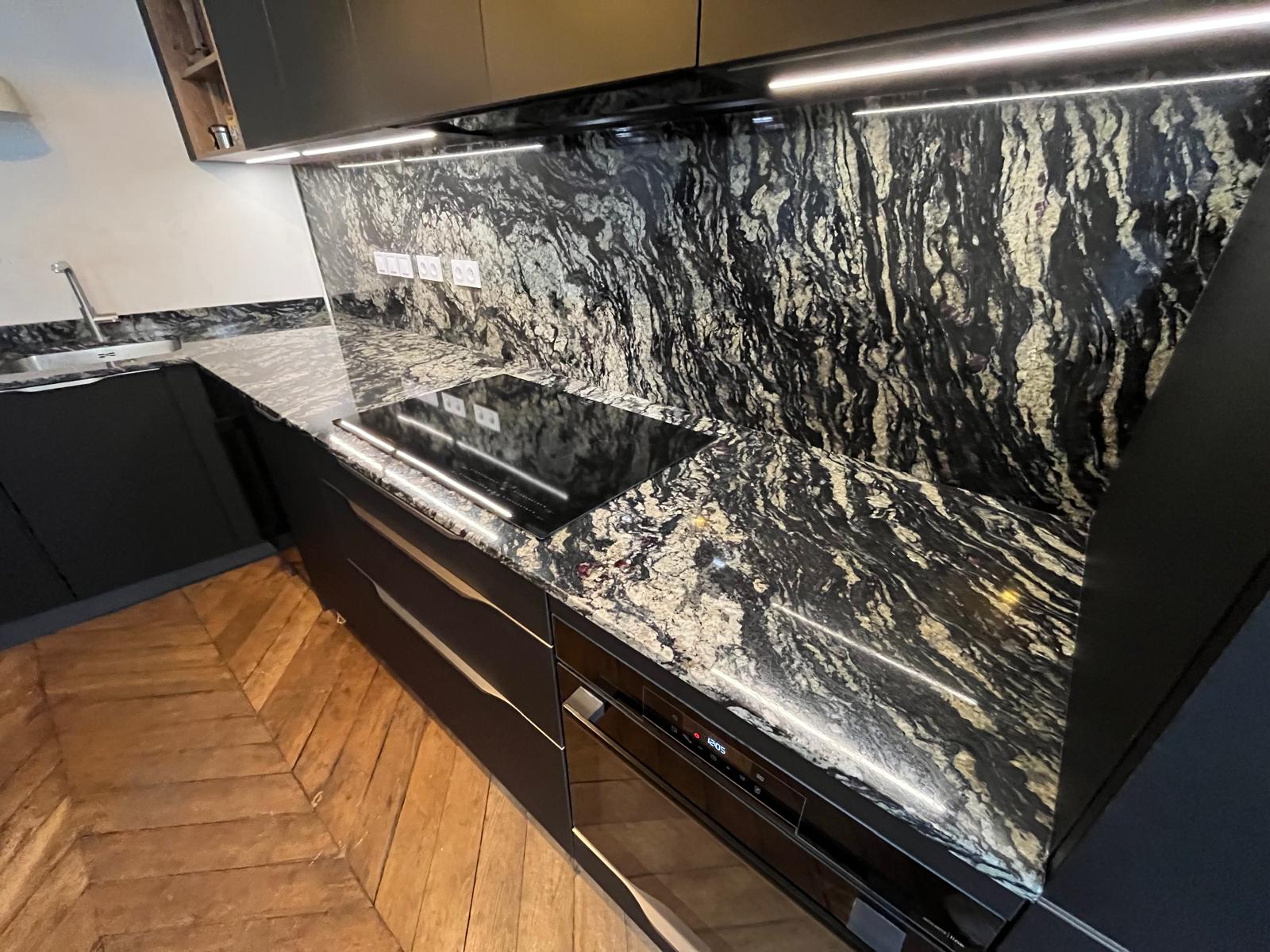 Lisse et brillante, c’est la finition classique des plans de travail en granit, avec des reflets.