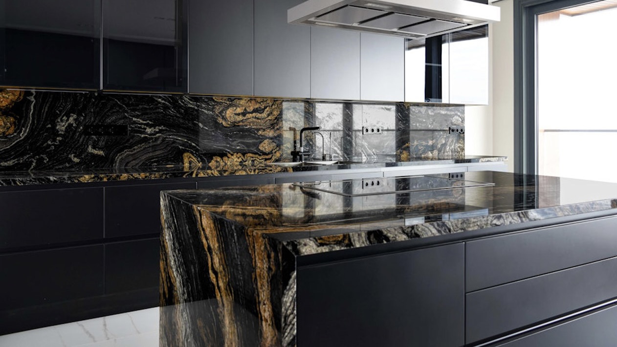 Lisse et brillante, c’est la finition classique des plans de travail en granit, avec des reflets.